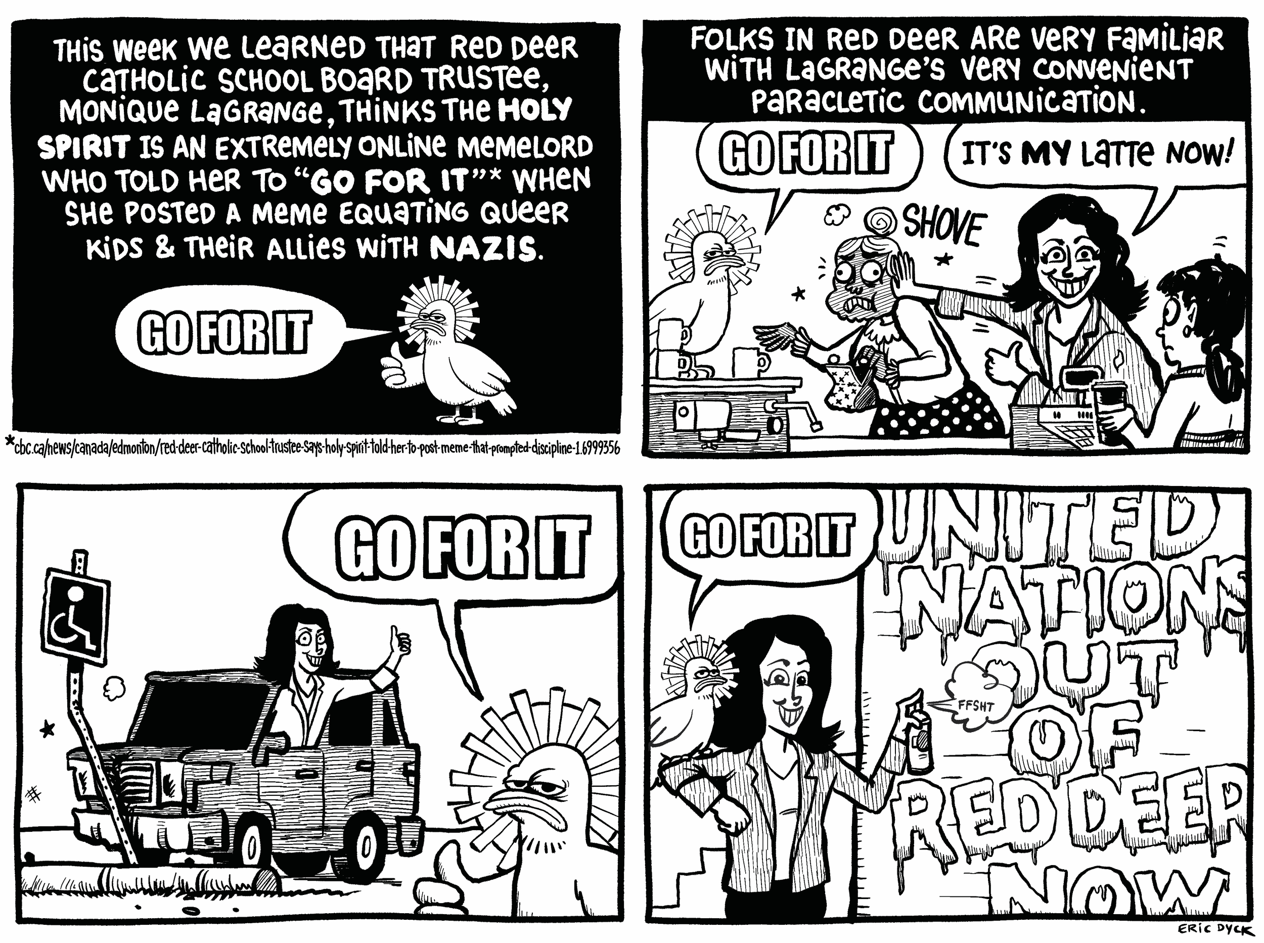 Should you read more about the context for this comic? Go for it! https://www.cbc.ca/news/canada/edmonton/red-deer-catholic-school-trustee-says-holy-spirit-told-her-to-post-meme-that-prompted-discipline-1.6999356