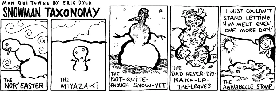 MON QUI TOWNE #159: SNOWMENS First Prev Archives Random Share Next Today First Prev Archives Random Share Next Today All images © Eric Dyck 2012 This week's Mon Qui Towne is full of snow-friends, big & small. Posted on December 17, 2012 Tags Mon Qui Towne, Snowfolk