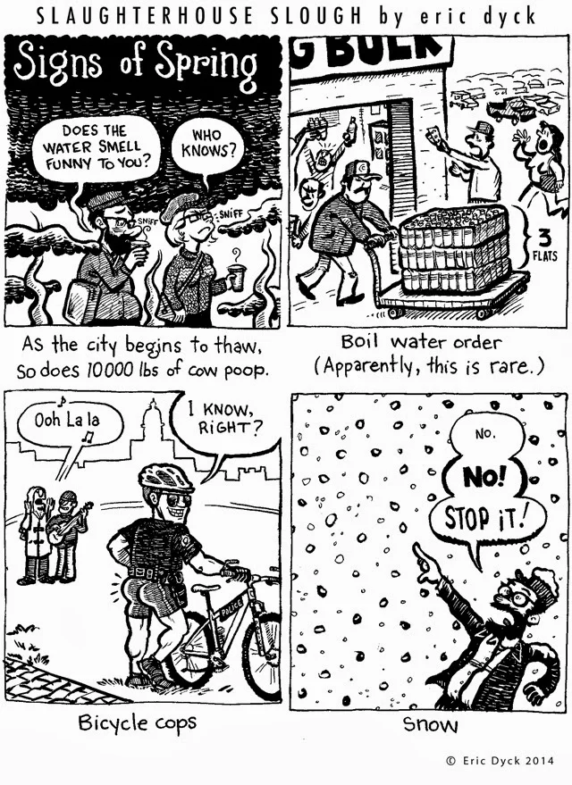 SLAUGHTERHOUSE SLOUGH #208: SPRING HAS SPRUNG First Prev Archives Random Share Next Today First Prev Archives Random Share Next Today Happy spring, everybody! Thank you, Lethbridge, for all the supportive feedback you've given me so far this year! If you like the idea of a Lethbridge-based comic strip, you can contribute to its creation here: http://www.patreon.com/slaughterhouseslough eric Posted on March 23, 2014 Tags Slaughterhouse Slough