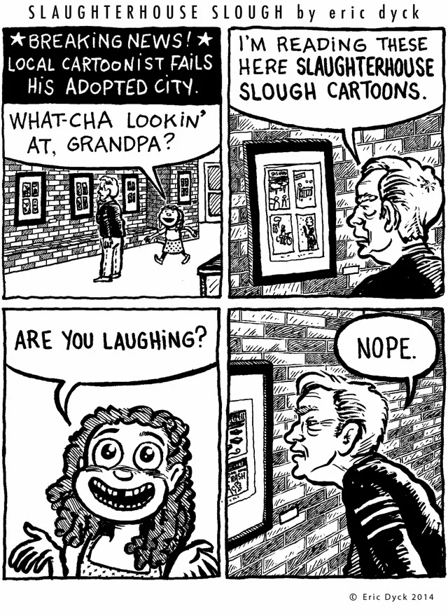 SLAUGHTERHOUSE SLOUGH #217: NOPE First Prev Archives Random Share Next Today First Prev Archives Random Share Next Today I've heard some amusing things from folks looking at my drawings over the years. I wasn't present for this one, but a Slaughterhouse Slough reader was generous enough to share this conversation with me! Posted on June 23, 2014 Tags Slaughterhouse Slough