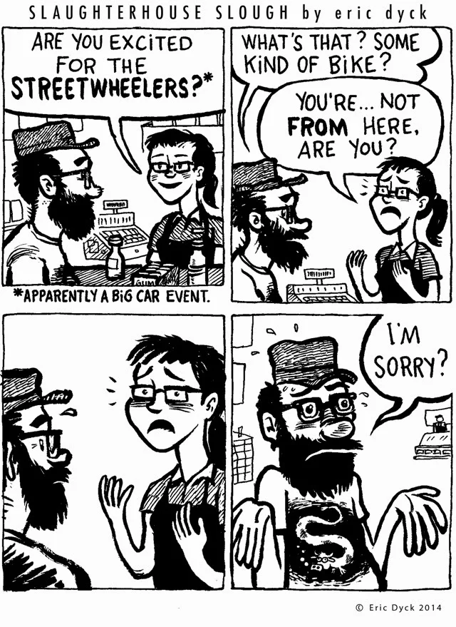 SLAUGHTERHOUSE SLOUGH #219: WHAT'S THAT, SOME KIND OF BIKE? First Prev Archives Random Share Next Today First Prev Archives Random Share Next Today This week's comic is brought to you by the Streetwheeler Festival, which I now know is totally a thing. My apologies to the good folks of Lethbridge watching faithfully from their lawn-chairs in the back of a pickup truck. Happy Car-thing, everybody! Posted on July 14, 2014 Tags Car-thing, Slaughterhouse Slough