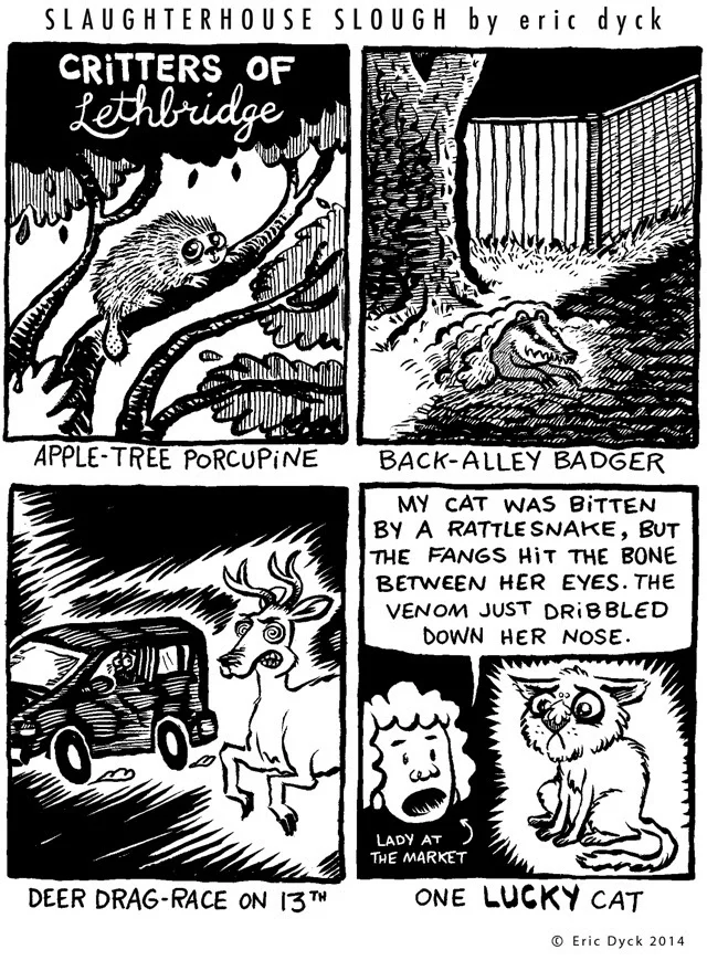 SLAUGHTERHOUSE SLOUGH #227: CRITTERS OF LETHBRIDGE PART 2 First Prev Archives Random Share Next Today First Prev Archives Random Share Next Today That's me in the car, racing the deer. The other critters were stories shared with me by folks who came to visit me at my table for Artwalk 2014! Posted on October 02, 2014 Tags Animals, Slaughterhouse Slough
