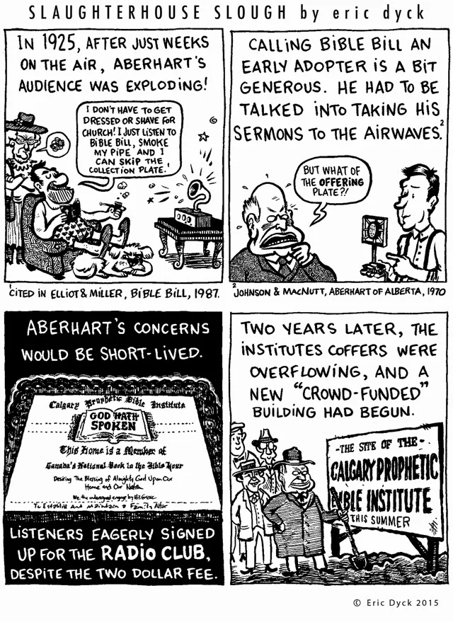 SLAUGHTERHOUSE SLOUGH #238: BIBLE BILL THE CROWDFUNDER First Prev Archives Random Share Next Today First Prev Archives Random Share Next Today This week's comic looks at how Bible Bill paid for the new building for the Calgary Prophetic Bible Institute. Posted on March 09, 2015 Tags Bible Bill, Slaughterhouse Slough