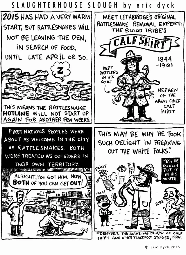 This week's comic is all about Calf Shirt! I am fascinated with all things rattlesnake these days, and I'm looking forward to the new season. I've been hoping to make a comic about Lethbridge's turn-of-the-century snake charmer for a while now. You can learn more about Calf Shirt in Hugh Dempsey's